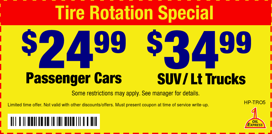 Good only atTire Rotation Special $24.99 Passenger Cars/$34.99 SUV/Lt Truck